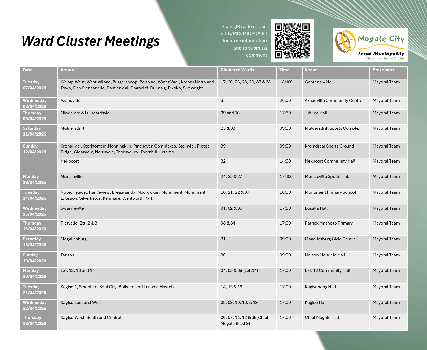 All comments must be forwarded to idp@mogalecity.gov.za, comments box at libraries or via WhatsApp: 083 787 2814 on or before 21 May 2026.
